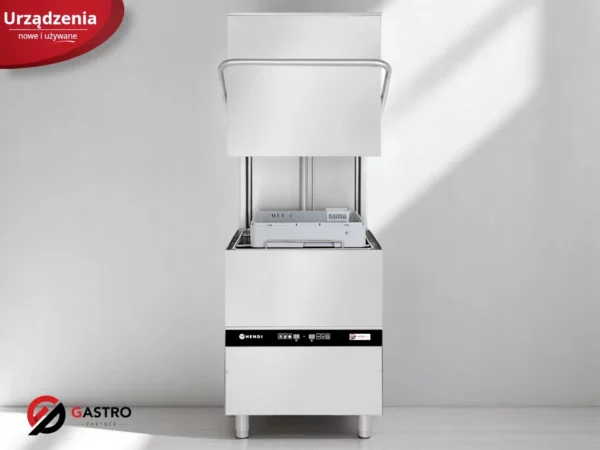 Uniwersalna zmywarka do naczyń o wymiarach kosza 500 × 500 mm dedykowana profesjonalnej gastronomii, wyposażona w termostat bezpieczeństwa oraz zawór zwrotny.